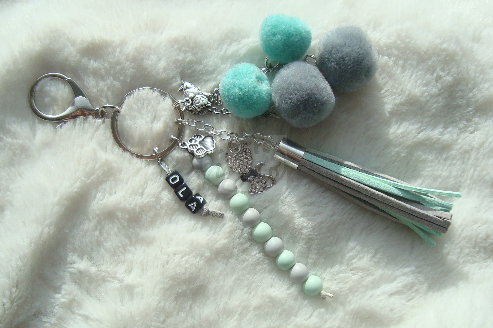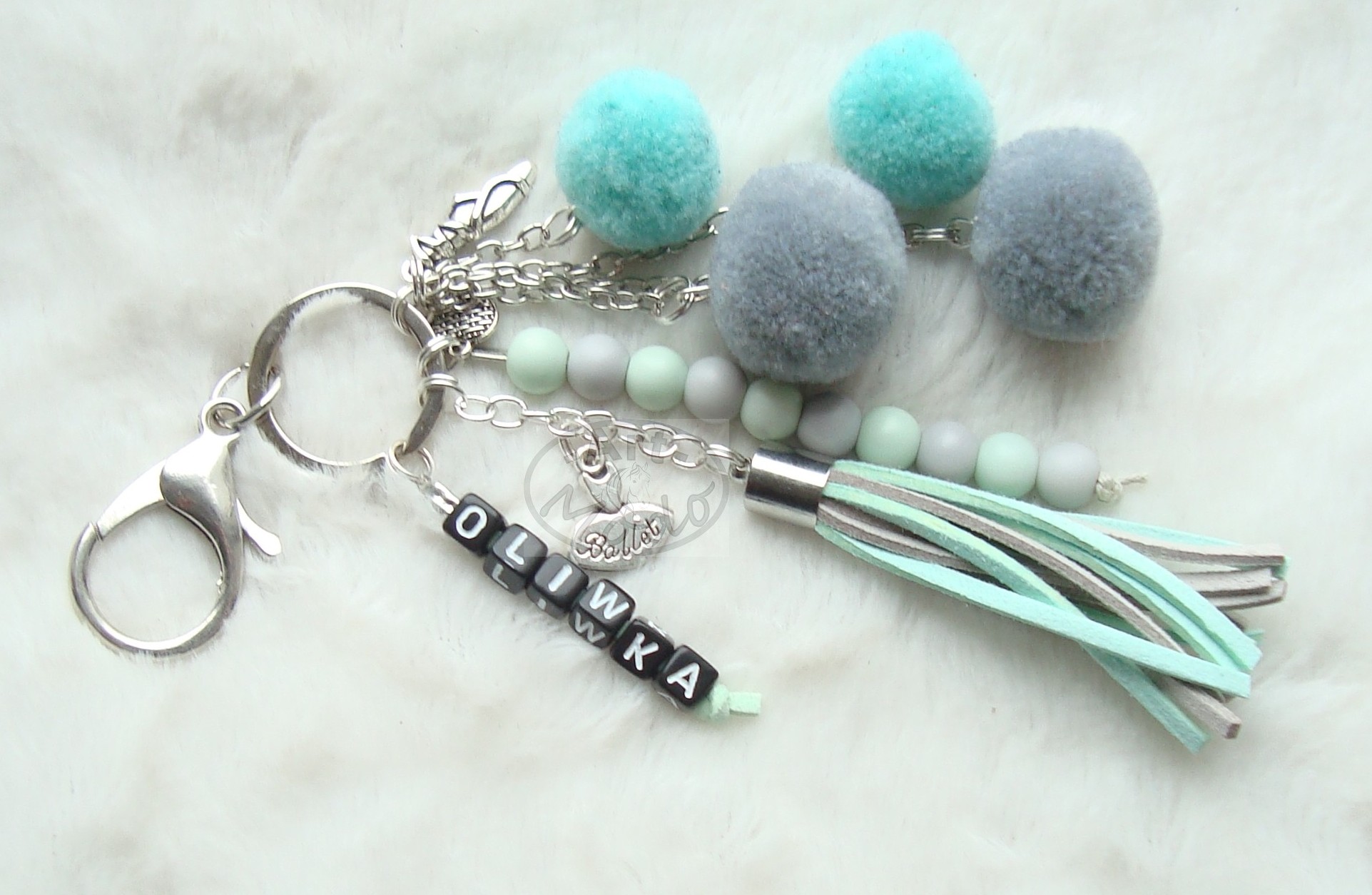 Spersonalizowany brelok w kolorach szary- mięta. Dodatki: pompony, koraliki szklane matowe, chwost z rzemieni zamszowych ekonomicznych, kosteczki akrylowe z literkami oraz tematyczne zawieszki w kolorze srebrnym.